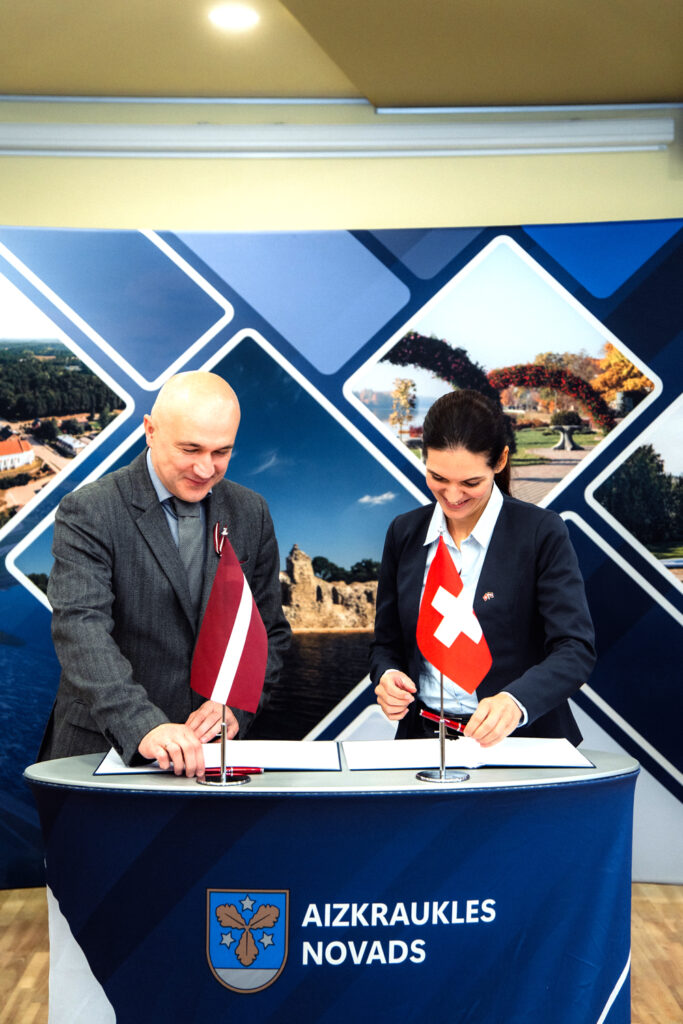 Apstiprinot sadarbību, Šveices Ekonomikas sekretariāta sadarbības un attīstības nodaļa vadītāja Laurence Mortiera un Finanšu ministrijas valsts sekretāres vietnieks Eiropas Savienības (ES) fondu jautājumos Armands Eberhards parakstīja vēsturiski piesārņoto vietu sanācijas programmas līgumu. Ar to oficiāli sākta teritorijas labiekārtošana Aizkrauklē.