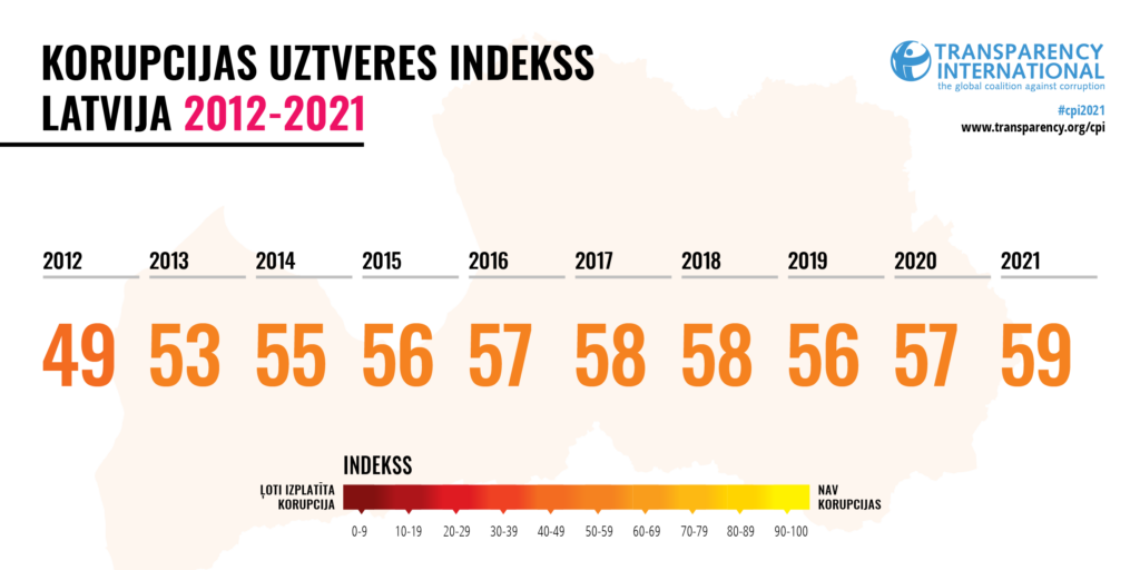 Starptautiskā pretkorupcijas organizācija Transparency International (TI) ir publicējusi Korupcijas uztveres indeksa (KUI) 2021. gada rezultātus. Latvijas rādītājs, salīdzinot ar 2020. gadu, ir pieaudzis par 2 punktiem, sasniedzot 59 punktus (no 100). Lai arī pieaugumu varam vērtēt kā soli pareizā virzienā, Latvijas KUI ilgstoši atpaliek no citām Eiropas Savienības un Eiropas sadarbības un attīstības organizācijas valstīm (OECD). Turklāt šis pieaugums nerada pārliecību, ka izdosies sasniegt Nacionālajā attīstības plānā 2021.–2027. gadam (NAP) noteikto mērķi – 2024. gadā 64 punktus un 2027. gadā – 67 punktus. Delnas norāda – lai uzlabotu Latvijas sniegumu, atbildīgajām institūcijām jārīkojas drosmīgi un jābeidz vilcināties ar lēmumu pieņemšanu un uzlabojumu veikšanu tādās jomās kā publisko resursu izšķērdēšanas novēršana, politiskās un biznesa godprātības (integritātes) veicināšana, turklāt sava artava korupcijas apkarošanā ir jādod arī privātajam sektoram.