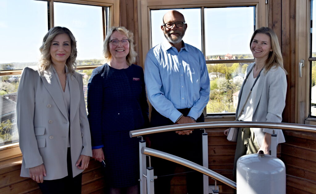 Anete Laugale (no kreisās), Linuta Ģerģe, Mārtiņš Putenis un Sanita Slaktere Bauskas Valsts ģimnāzijas tornītī. Foto: Uldis Varnevičs