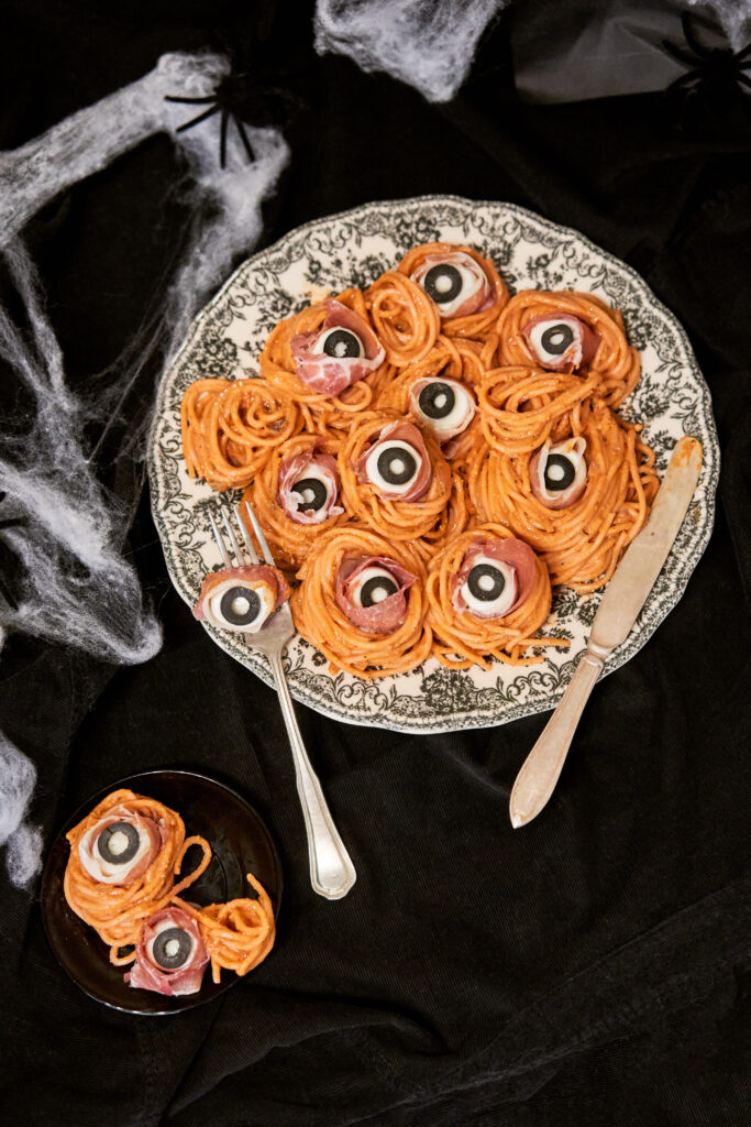 - Pagatavo “acis” – sagriez olīvas plānās ripiņās, no kā veidot acs zīlīti. Mocarellas bumbiņām nogriez nelielu gabaliņu, lai izveidojas līdzena virsma, uz kuras vēlāk likt olīvas gabaliņu. Katru mocarellas bumbiņu aptin ar prošuto šķēli, liec virsū olīvas ripiņu, lai sanāk “izrautas acs” efekts.