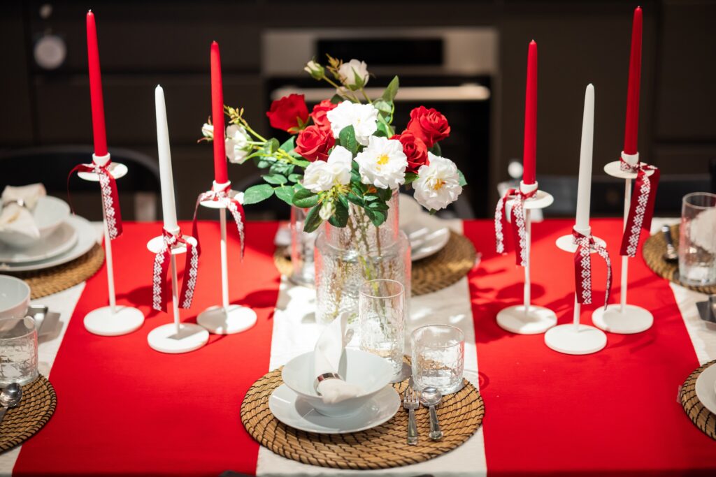 Interjera dizainers skaidro, ka cilvēkiem sarkans galda tekstils bieži saistās ar Ziemassvētkiem, tāpēc kāds varbūt vilcinās to izmantot arī valsts svētkos. Tomēr D. Rimkus iesaka izmantot to kā galveno akcenta krāsu, lai radītu asociācijas ar karogu. “Svētku noskaņai kā pamatu var izmantot baltu galdautu, ko papildināt ar galda celiņiem sarkanā krāsā. Tie ir jānovieto paralēli galda īsākajai malai – izmantojot divus galda celiņus var lieliski panākt karoga efektu.