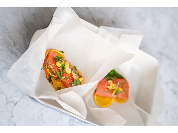- Cepampapīru centā liec pa trim šķēlēm apelsīna. Pa virsu klāj laša fileju, sāli, sviestu un garšaugus. Pēc tam aizloki cepampapīru ciet kā paciņu. Ja nepieciešams, aizspraud ar koka knaģi vai iesmiņu. Cep krāsnī 10-12 minūtes.