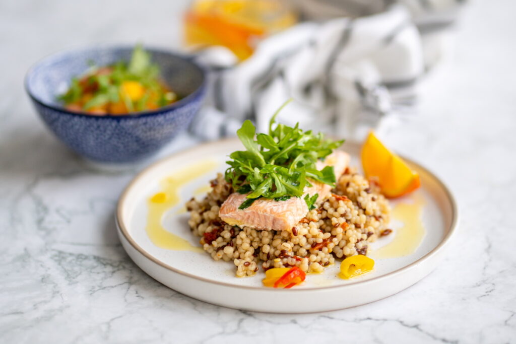 - Pasniedz gudros graudus, pa virsu liekot zivs fileju un rukolu. Visam pārlej garšaugu eļļu.