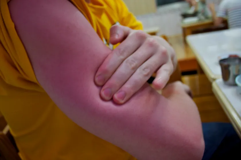 - Uz ādas klāj mitras, vēsas dvieļu kompreses, kuras atstāj uz 10 līdz 15 minūtēm. Šo procedūru atkārto vairākas reizes dienā, jo mitrās kompreses palīdz atvēsināt ādu, mazina diskomfortu un sāpīgumu.