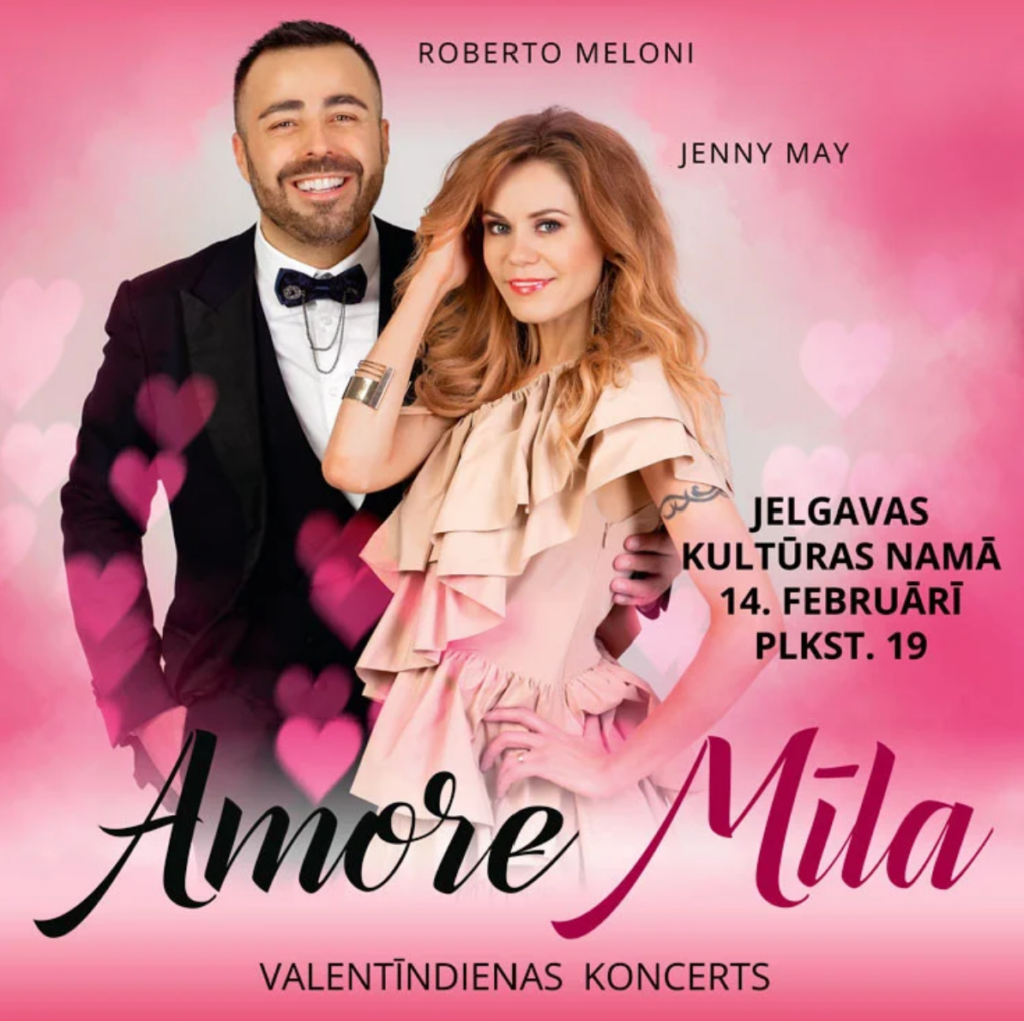 Temperamentīgie dziedātāji Roberto Meloni un Jenny May Valentīndienas, 14. februāra, vakarā Jelgavas Kultūras namā aicina uz neparastu tikšanos visus, kam mīlestība nav sveša. Koncertprogrammā “AMORE-MĪLA” mūziķi jūs gaidīs uz īstu, privāti muzikālu tikšanos, atklājot par sevi patiesus un līdz šim nedzirdētus mīlestības stāstus. Turklāt nav svarīgi, vai esat attiecībās vai brīvs, jo varbūt tieši šajā koncertā sastapsiet savu lielo mūža mīlestību! Ikviens vēlas būt mīlēts, tāpēc mūziķi izpildīs visiem labi pazīstamas, trauslas un dziļi personiskas, karstasinīgas un kaisles pilnas kompozīcijas astoņās valodās.