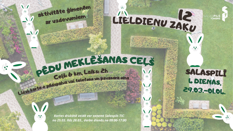 No 29.marta līdz 1.aprīlim Salaspilī būs paslēpušies 12 zaķi – ikviens interesents aicināts doties 6 km garā pastaigā, iepazīstot Salaspili, izmantojot spēles karti ar uzdevumiem un sacentieties par balvām. Digitālā karte būs pieejama šeit no 25.marta. Pirms spēles tiks publicēta saite, kurā nepieciešams iesniegt atbildes. 3.aprīlī tiks organizēta izloze, kurā varēs laimēt balvas no vietējiem amatniekiem un mājražotājiem. Plašāka informācija par aktivitāti šeit.