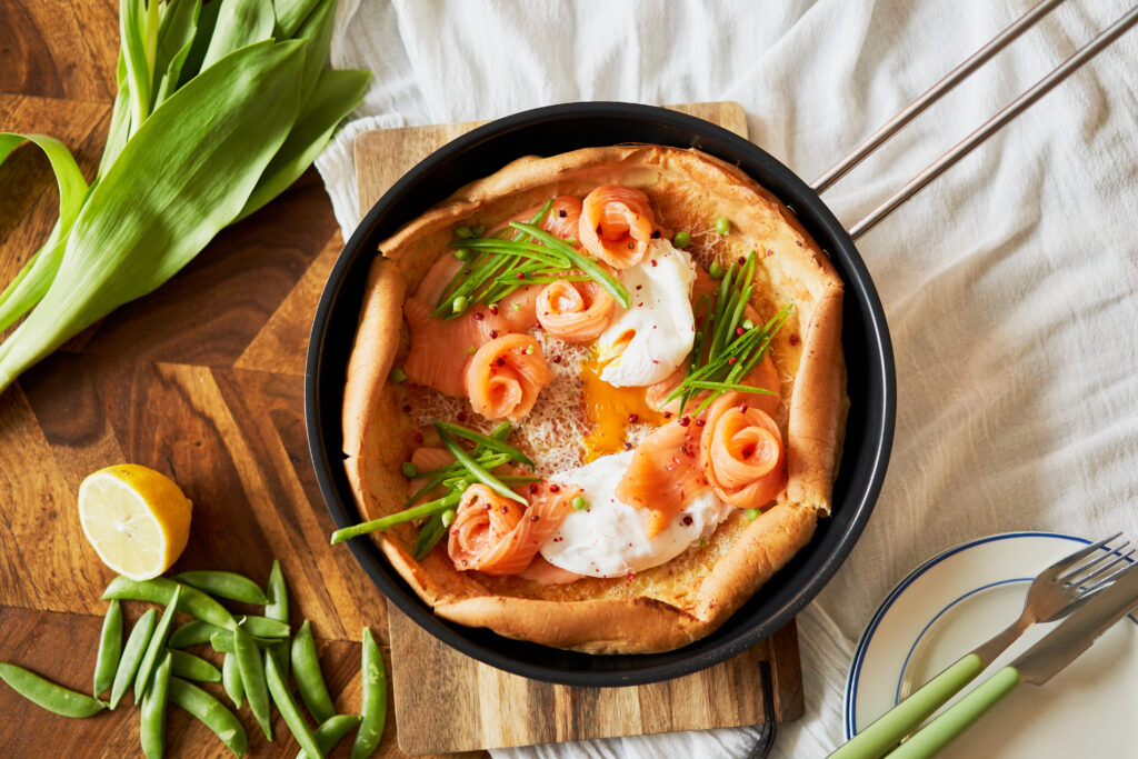 - Izņem pankūku no cepeškrāsns, pārber ar rīvētu sieru, zaļumiem, pasniedz uzreiz kopā ar lasi un plaučolām.