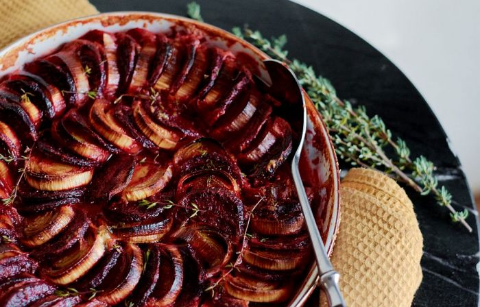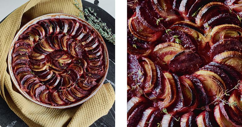 4) Šo maisījumu izlej virsū bietēm un puraviem, noklāj cepamtrauku ar foliju un cep iepriekš sakarsētā cepeškrāsnī (180 grādos) 40-50 minūtes.
