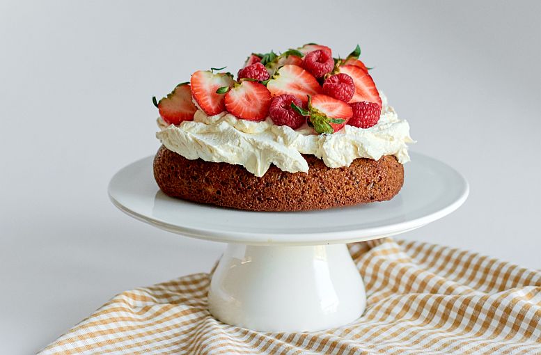 7) Pagatavo krēmu – saputo vai samaisi rikotu ar krēmsieru, medu un kanēli, un liec to kūkai virsū, izlīdzina ar karoti piešķirot krēmam formu pēc savas izvēles.