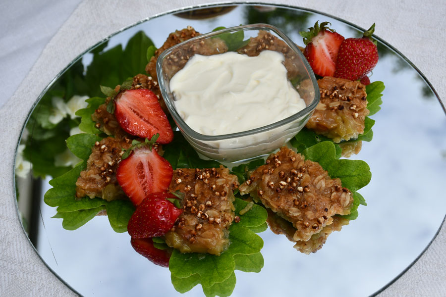 Rabarberu kraukšķis ar svaigā siera krēmu un zemenēm