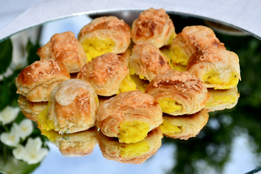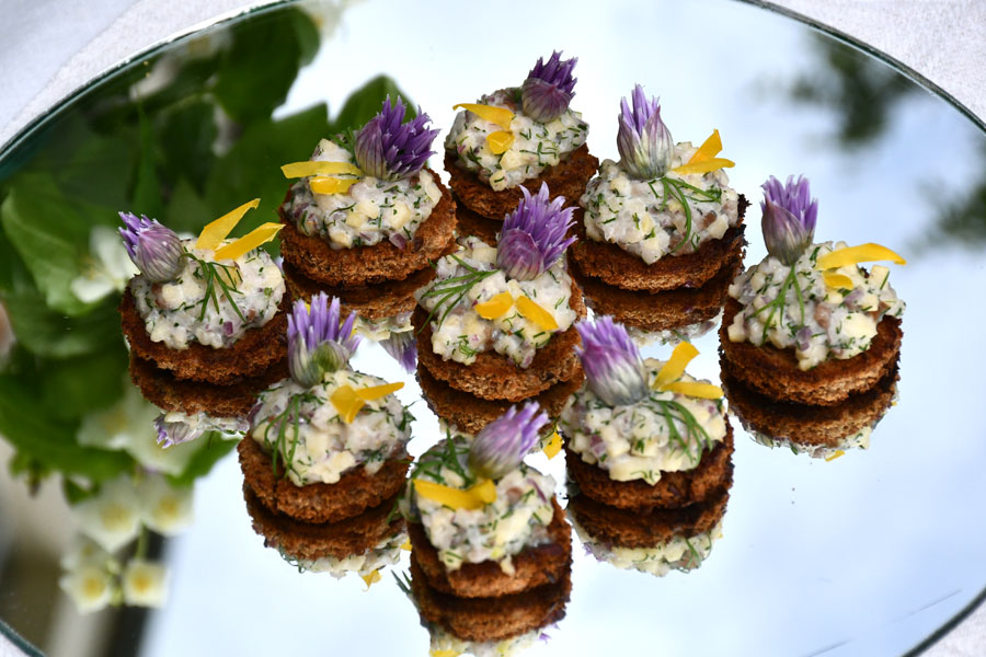 E. Zviedre pastāsta par vienu no uzkodu dekorācijām – sīpolu ziedu, kas ir ēdams un arī vizuāli pievilcīgs. Tā garša ir gluži kā sīpolam, taču ne visi izvēlas baudīt šo dekorāciju kopā ar uzkodu.