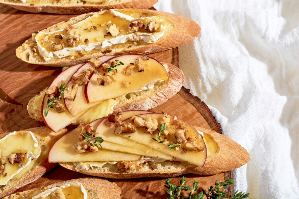 3. Sagriez plānās šķēlītēs ābolu, kārto to virsū sieram. Apslaki maizītes ar medu un uzber virsū valriekstus.