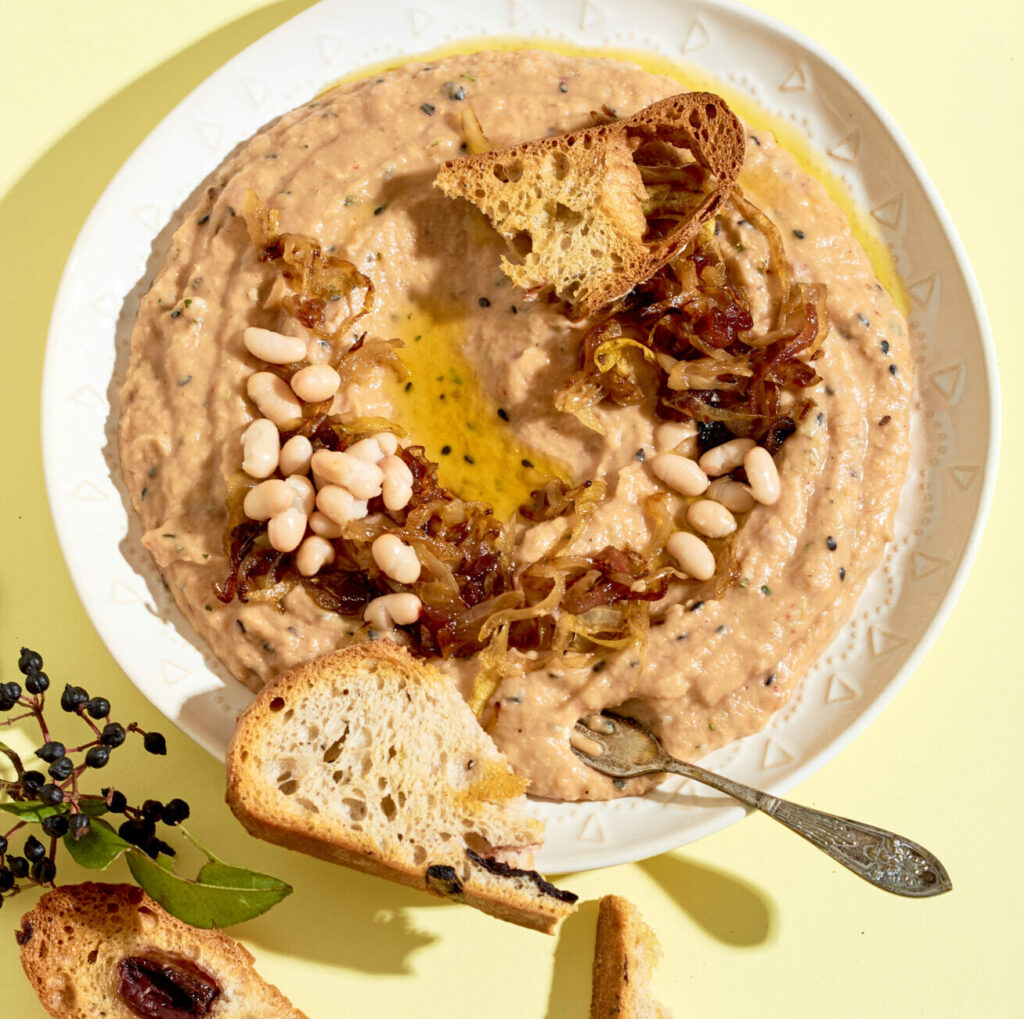 Balto pupiņu un karamelizētu sīpolu smēriņš (vegānisks)