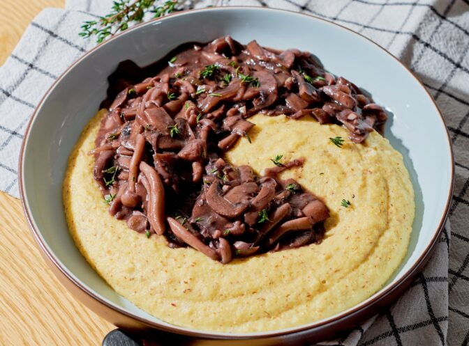 Vegāniskā polenta ar sēņu ragū sarkanvīna mērcē