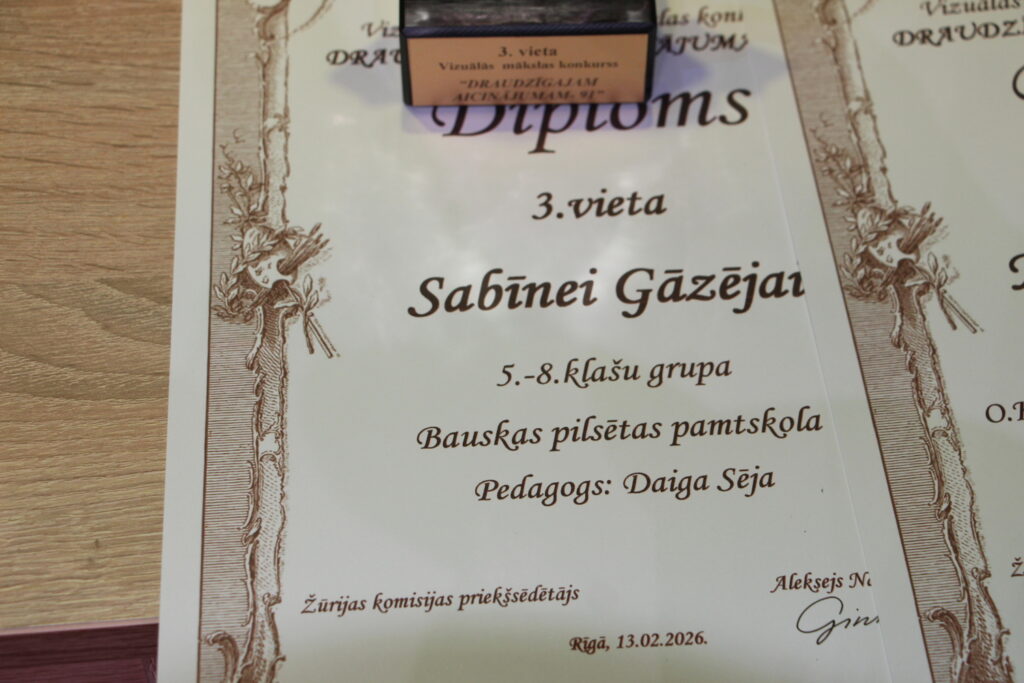 “Draudzīgā aicinājuma” vizuālās mākslas konkursa 5.klases skolēni Sabīne Gāzēja un Tomass Līvmanis zīmēja ziemas gadskārtu tradīciju svinēšanu – ķekatās iešanu, bluķa vilkšanu, informēja Bauskas pamatskolas skolotāja Daiga Sējēja. Atzinības rakstus izpelnījās arī seši Īslīces 1.-4.klašu audzēkņi, kuri zīmēja pavasara un rudens tradīcijas ģimenē, bet diemžēl uz sarīkojumu nebija ieradušies – puteņa vai transporta problēmu dēļ.