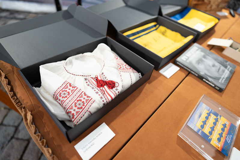 Labdarības akcijas kulminācijā improvizētā vairāksolīšanā ikviens varēja iegādāties unikālus priekšmetus no Ukrainas ar simbolisku un emocionālu nozīmi, tostarp karā bojāgājušā ukraiņu fotogrāfa Denisa Krivija darbu, suvenīru glāžu komplektu un aproci no pārstrādātām patronu čaulām, kā arī Ukrainas bērnu radītus rokdarbus. Izsolāmo priekšmetu vidū bija arī vienības “Azov” karogs ar komandiera parakstu, grāmata “Mariupoles acis”, sudraba auskari, kas godā leģendāro un pasaulē lielāko Ukrainā ražoto lidmašīnu “Mrija”, kara mediķes Sarmītes Cīrules uzšuve, krusts un citas īpašas lietas.