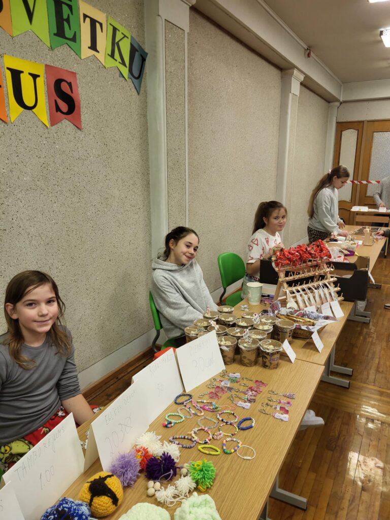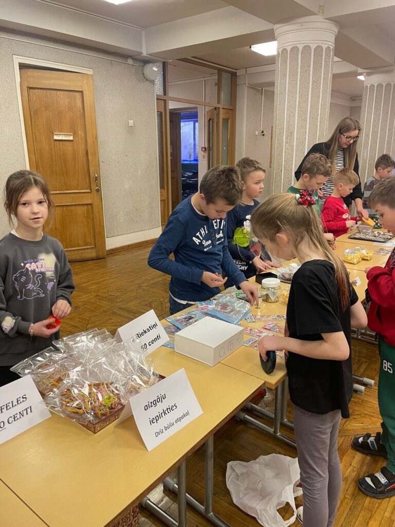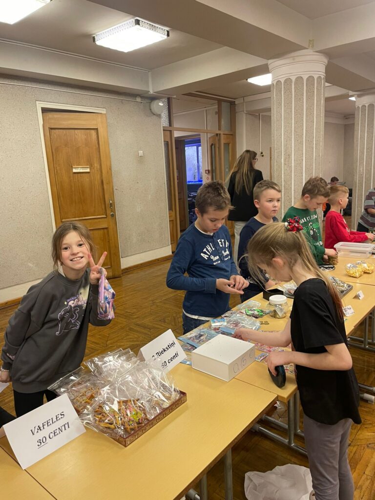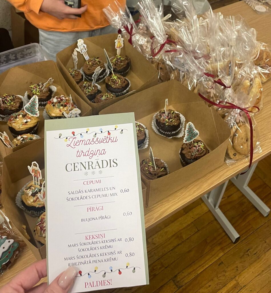 Tirdziņā skolēni piedāvāja pašu gatavotus gardumus – dažāda veida vafeles, pildītos riekstiņus, ābolmaizes, pīrādziņus, kā arī ābolu sulas un pat kakao. Līdzās ēdamlietām netrūka arī praktisku un radošu darinājumu – atslēgu piekariņu, eglīšu rotājumu, rotaļlietu un rotaslietu, kas tapušas ar bērnu izdomu un rūpību.