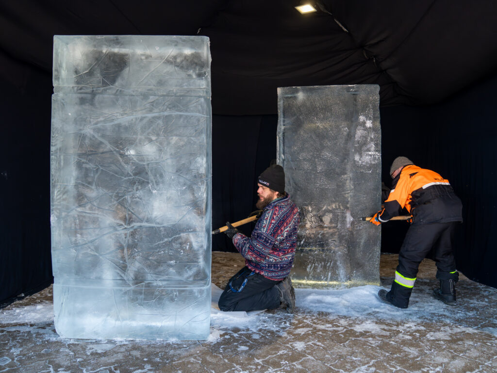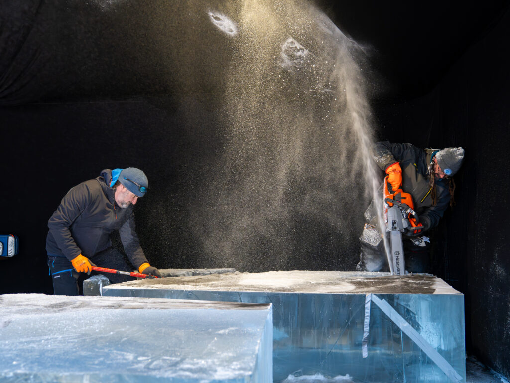 FOTO: Jelgavā ledus pārtop ilūzijās – mākslinieki no 12 valstīm sāk darbu pie skulptūru veidošanas