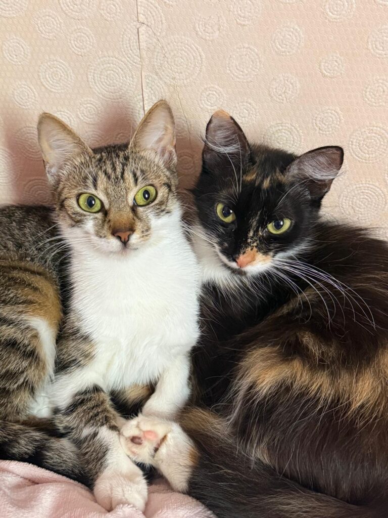 Keitija un Deizija. Abas ļoti mīļas, kārtīgas. Uzvedas ļoti labi. Mīl paēst un pēc tam nākt mīļoties un murrāt.