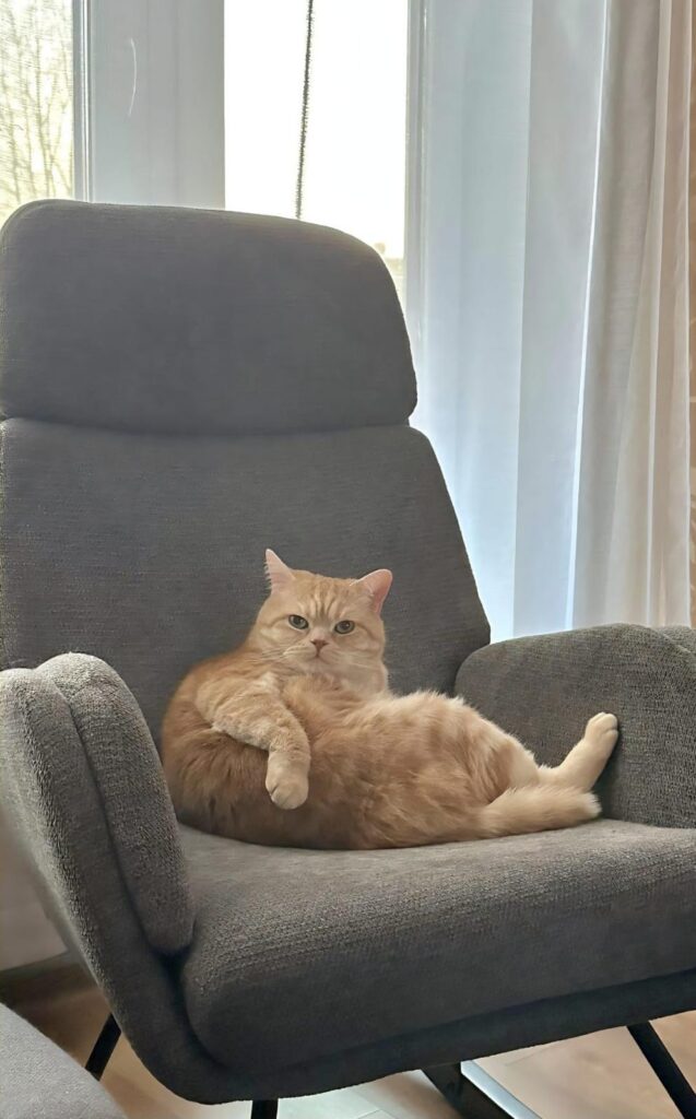 Citruss. Cilvēks nopirka šo šūpuļkrēslu it kā sev, lai varētu mierīgi atpūsties pēc garas dienas. Bet, kā jau bieži notiek šajā mājā, es ātri ieviesu kārtību. Krēsls ir ērts, skats labs, un tas lieliski der valdniekam. Tagad tas ir mans tronis. Cilvēks drīkst apsēsties citur.