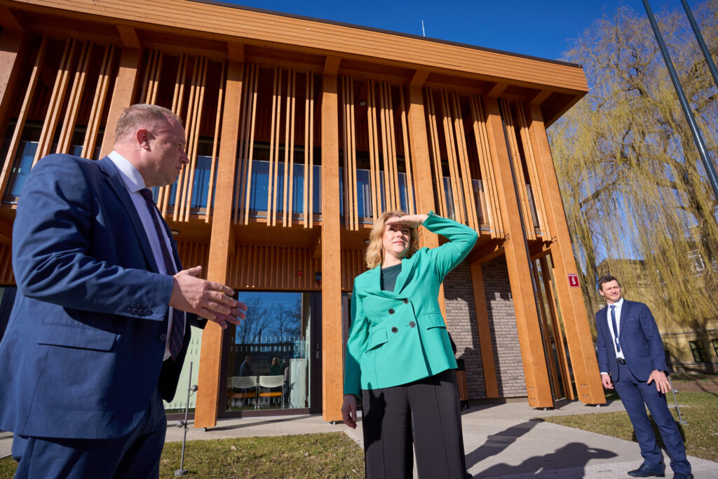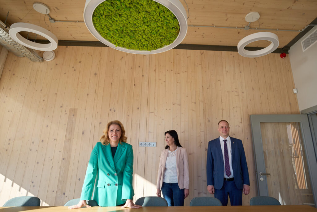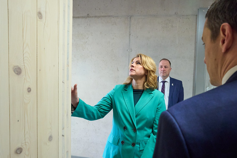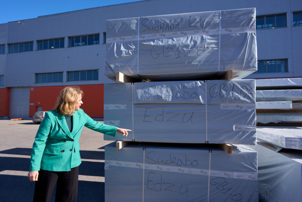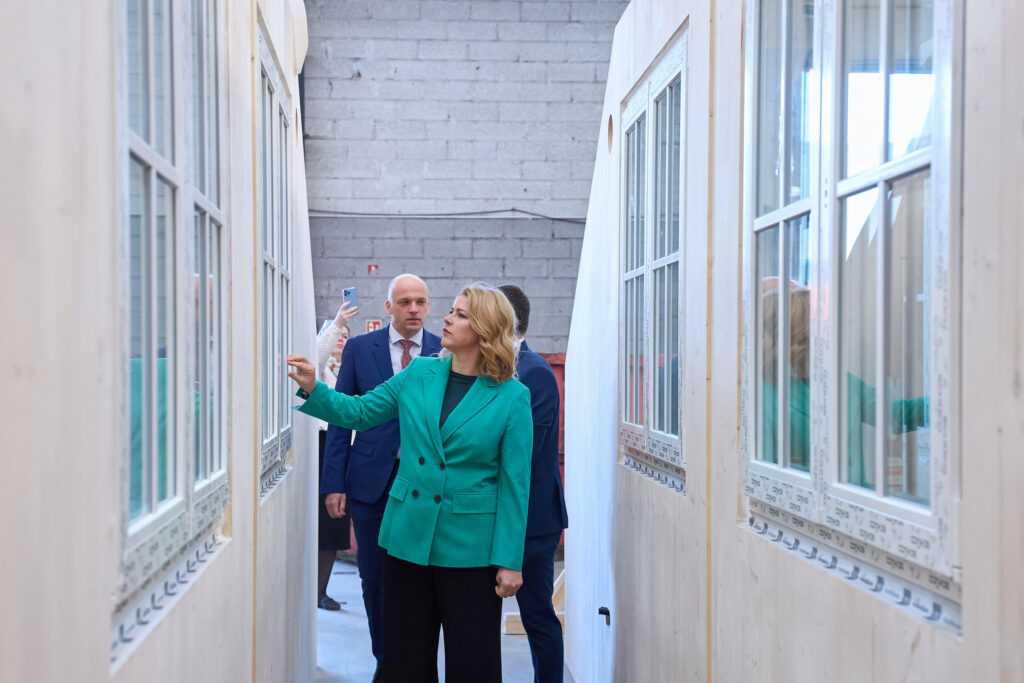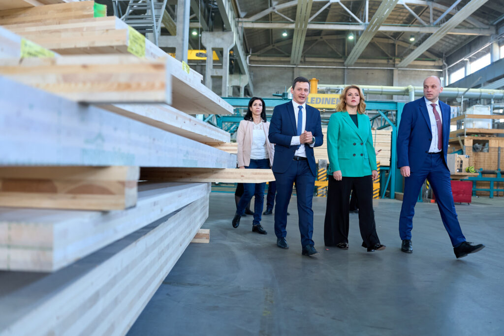 Apmeklējot šķērsām līmēta koka paneļu ražotni “CLT Profi”, Ministru prezidente ar uzņēmuma vadītāju Andri Dlohi pārrunāja kokrūpniecības attīstības iespējas Latvijā un nepieciešamību virzīties uz augstākas pievienotās vērtības produktu ražošanu.