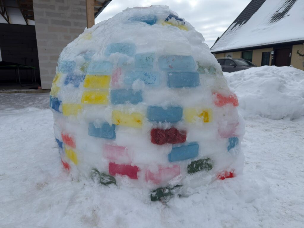 Būvniecība prasīja pacietību: pēc katras klucīšu kārtas bija jāgaida vairākas stundas, līdz tā sasalst, bet saķerei izmantots sniegs ar ūdeni. “Ja gribētu visu paveikt vienā dienā, tas ir nereāli,” norāda Karīna. Kad process kļuva saprotams, pie darba iesaistījās arī bērni Megija un Olivers – viņi palīdzēja liet ūdeni, krāsot un izņemt sasalušos klucīšus. Tiesa, interese uz brīdi noplaka, daļu darba Karīna turpināja viena, taču viņai bijis svarīgi bērniem parādīt, ka iesāktais jāpabeidz.