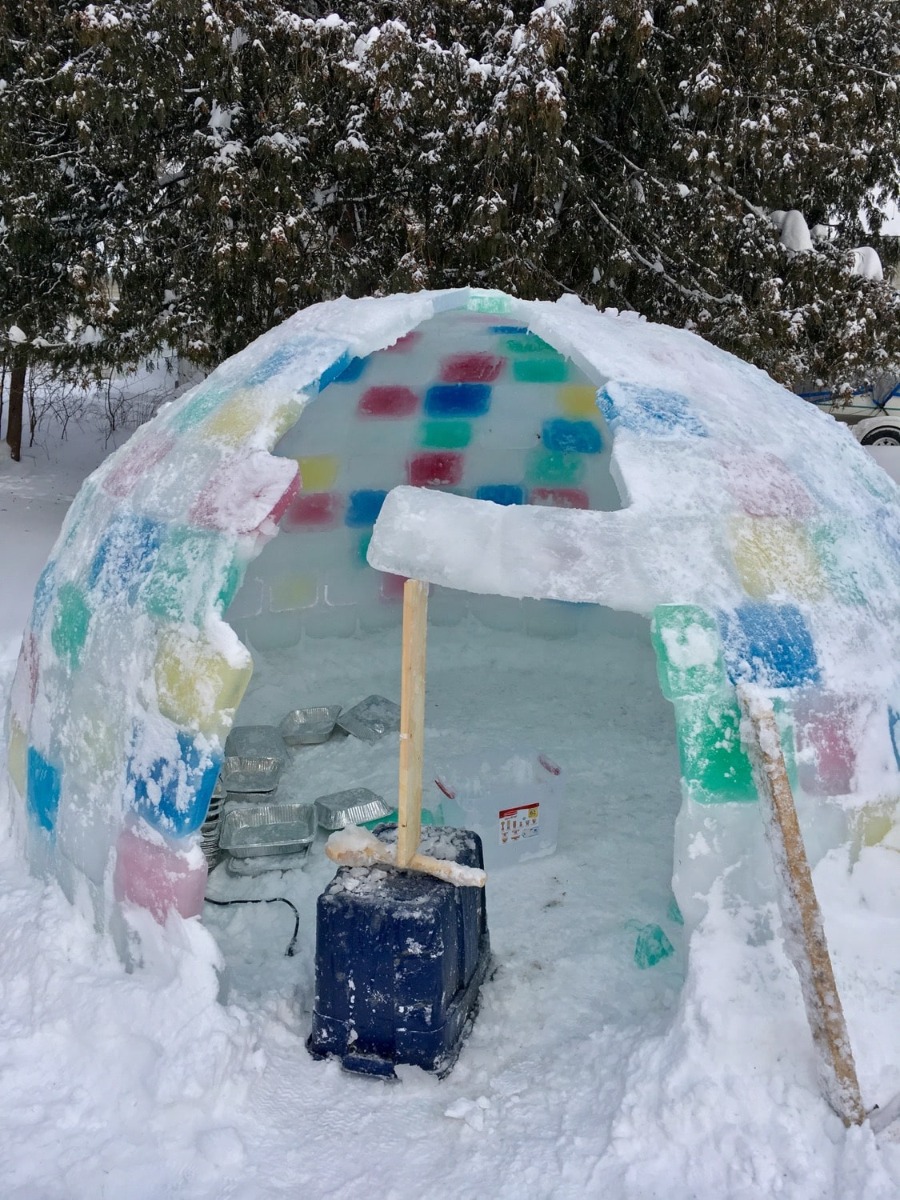Sākotnēji igla plānota mazāka, taču, liekot kārtu pēc kārtas, tā izauga lielāka, nekā iecerēts. Tagad tajā var ielīst gan bērns, gan pieaugušais. Kad mājas vārti ir atvērti, krāsaino iglu var redzēt arī no ceļa, un to pamana garāmgājēji. Vakaros ģimene savā ledus celtnē ievieto svecīti, un ledus klucīši sāk mirdzēt – igla izskatās kā liela, daudzkrāsaina kristāla vāze.
