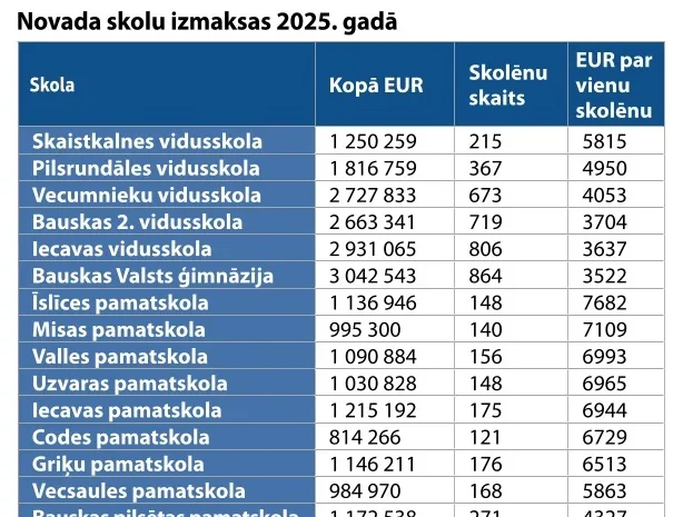 Bauskas novadā izmaksas par vienu audzēkni skolās svārstās no 3522 līdz 7682 eiro, rāda «Bauskas Dzīves» aprēķini pēc publiski pieejamajiem datiem.