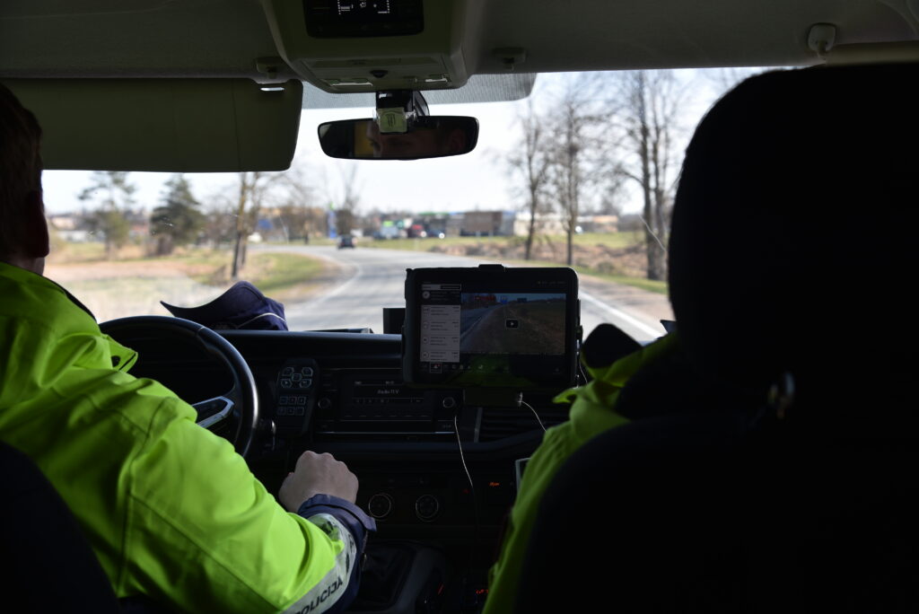 Ar Valsts policijas Zemgales reģiona pārvaldes Dienvidzemgales iecirkņa Reaģēšanas nodaļas inspektoriem Kristīni Lakstīgalu un Elvi Pauloviču pulksten 10 devāmies cauri Bauskai uz Vecsaules pusi. E. Paulovičs stāsta, ka mašīnai ar jauno trafarējumu radars ātrumu reģistrē tuvāk braucošām mašīnām, tāpēc to lielākoties izmanto reidiem pilsētās.
