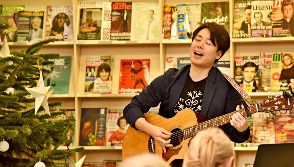 Šeit sapratis, cik liela nozīmē mūzikai un dziesmām ir Latvijas kultūrā un pats nolēmis dziedāt ģitāras pavadījumā dziesmas latviešu valodā. Tad uzsācis arī darbību sociālajos tīklos, kur salīdzina Japānu, Latviju un abu valstu kultūras. Ar savām dziesmām pabijis ne tikai Latvijā, bet arī latviešu diasporās citur pasaulē. Pasākumā ar pazīstamām un mazāk zināmām dziesmām un melodijām aizrāva sanākušos, kas dziedāja līdzi.