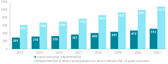 Pagājušajā gadā, palielinoties rīcībā esošajiem ienākumiem, pieauga arī nabadzības riska slieksnis, sasniedzot 513 eiro mēnesī vienas personas mājsaimniecībai (2020. gadā – 472 eiro mēnesī). Mājsaimniecībām ar diviem pieaugušajiem un diviem bērniem līdz 14 gadu vecumam nabadzības riska slieksnis 2021. gadā sasniedza 1 077 eiro mēnesī (2020. gadā – 991 eiro mēnesī).