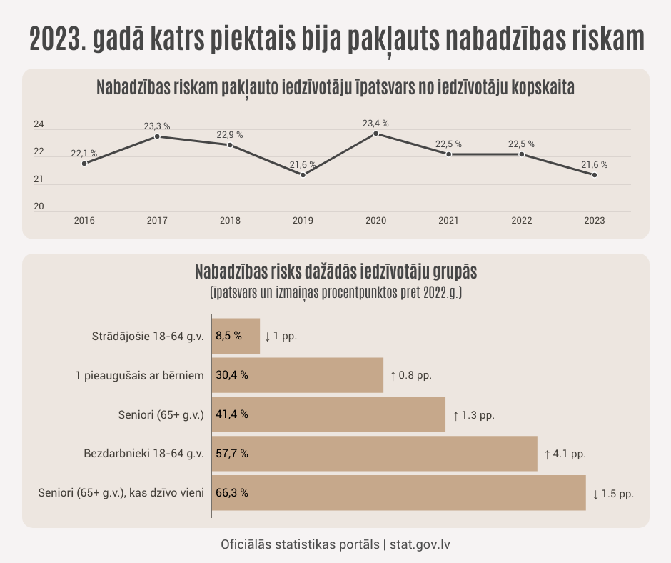 Nabadzības risks pieauga mazāk aizsargātām iedzīvotāju grupām – bezdarbniekiem (18 līdz 64 gadi) nabadzības risks pērn sasniedza 57,7 % (kopš 2022. gada kāpums par 4,1 procentpunktu), senioriem vecumā no 65 gadiem – 41,4 % (kāpums par 1,3 procentpunktiem), mājsaimniecībām ar vienu pieaugušo un apgādībā esošiem bērniem3 – 30,4 % (kāpums par 0,8 procentpunktiem) un mājsaimniecībām ar diviem pieaugušiem un trim vai vairāk apgādībā esošiem bērniem – 20,8 % (kāpums par 1,3 procentpunktiem). Savukārt vecāka gadagājuma (65 gadi un vairāk) iedzīvotājiem, kuri dzīvoja vieni, nabadzības risks nedaudz samazinājās – no 67,8 % 2022. gadā līdz 66,3 % 2023. gadā. Pārējiem iedzīvotājiem nabadzības risks saglabājās bez būtiskām izmaiņām.