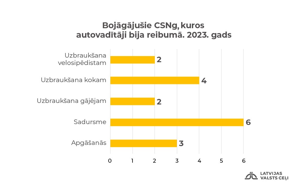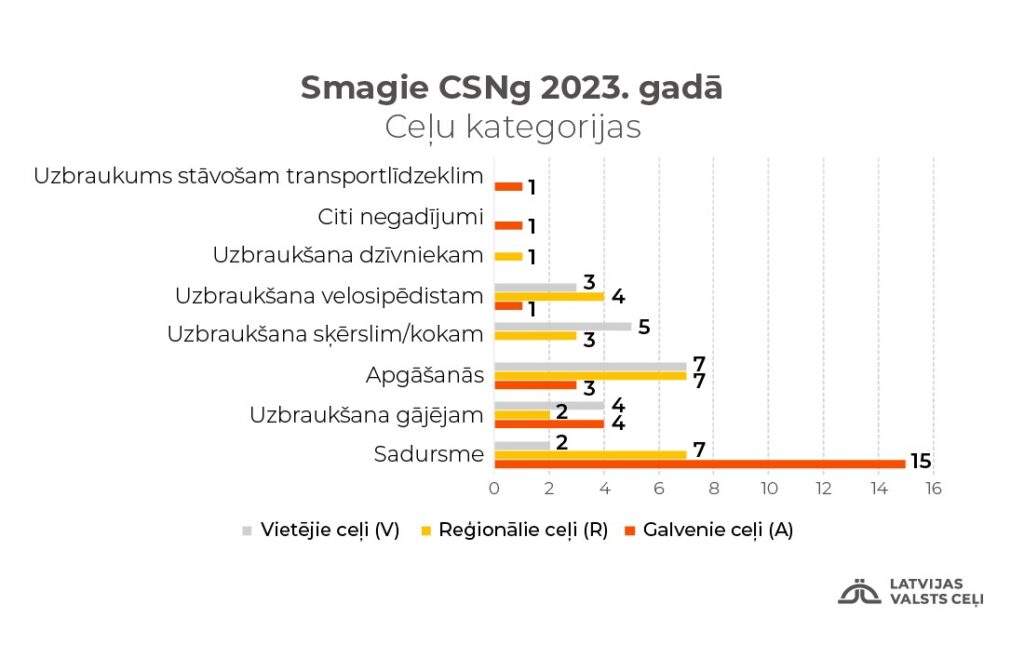 Salīdzinot ar 2022. un 2021. gada statistiku, šogad 10 mēnešos, ir ievērojami pieaudzis smago ceļa satiksmes negadījumu (CSNg) skaits uz valsts vietējās nozīmes autoceļiem, izpētījuši VSIA „Latvijas Valsts ceļi” speciālisti. Uz minētajiem ceļiem īpaši bieži notika apgāšanās, uzbraukšanas kokam un gājējiem. Puse no visiem smagajiem CSNg, kurus izraisījuši autovadītāji alkohola reibumā, notika uz vietējās nozīmes autoceļiem. Valsts vietējās nozīmes ceļiem raksturīga neliela satiksmes intensitāte un mazāka policijas klātbūtne, uz tiem netiek pielietoti elektroniskie kontroles līdzekļi (radari u.c.).