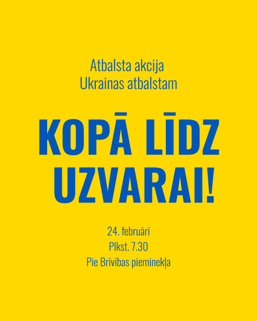 24. februārī – dienā, kad apritēs jau ceturtais gads kopš Krievijas pilna mēroga iebrukuma Ukrainā, – Rīgā, pie Brīvības pieminekļa, notiks Ukrainas atbalsta akcija “Kopā līdz uzvarai!”.