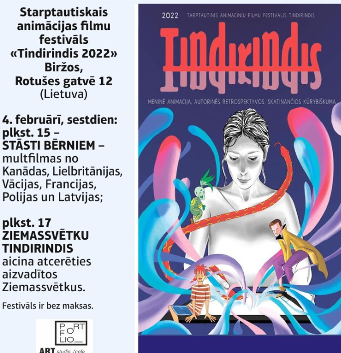 Sestdien, 4. februārī, Biržos (Latvijas Lietuvas pierobežas pilsētā) mākslas galerijā “Portfolio”, Rotušes ielā 12 tiks izrādīta starptautiskā animācijas filmu festivāla “Tindirindis 2022” multfilmu programma bērniem un jauniešiem. Aicināti arī visi pārējie, kurus interesē krāsainā animācijas pasaule, dalība pasākumā ir bez maksas, portālu informēja rīkotāji.