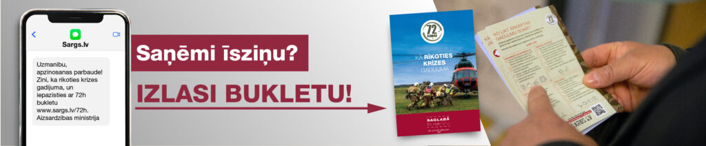 Iedzīvotājiem īsziņas tiks izsūtītas no sūtītāja “Sargs.lv” ar šādu saturu: “Uzmanibu, apzinosanas parbaude! Zini, ka rikoties krizes gadijuma, un iepazisties ar 72h bukletu www.sargs.lv/72h. Aizsardzibas ministrija”.