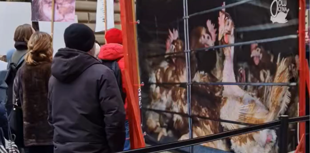 Sanākušajiem rokās bija plakāti, kas vēstīja, piemēram, “Brīvību vistām”, “Nē cietsirdībai”, “Sprosts nav dzīve”, foto ar vistām būros un pavadošo tekstu – “Vistu elle”, “Lūdzu, palīdzi man!”.