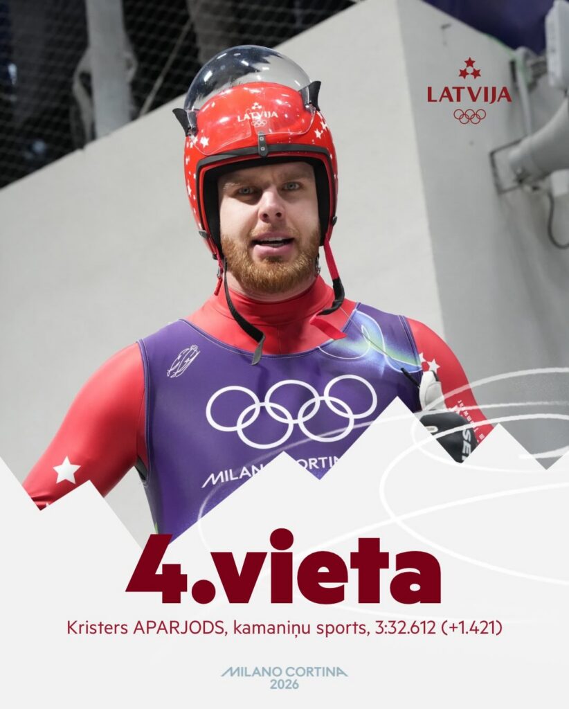 Latvijas sportists Kristers Aparjods svētdien Kortīnā d’Ampeco olimpisko spēļu sacensībās kamaniņu sportā izcīnīja ceturto vietu, kamēr Gints Bērziņš bija desmitajā pozīcijā.