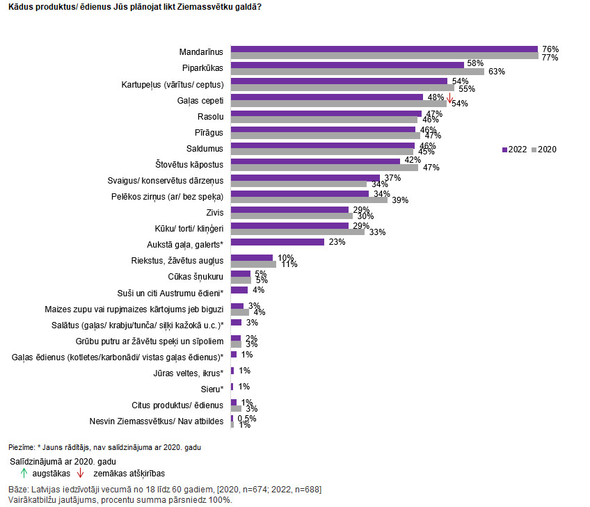 Lielākā daļa Latvijas iedzīvotāju vecumā no 18 līdz 60 gadiem, Ziemassvētku galdā ir iecerējuši likt mandarīnus (76 %), piparkūkas (58 %), vārītus/ ceptus kartupeļus (54%), gaļas cepeti (48%), rasolu (47%), pīrāgus (46%), saldumus (46%), štovētus kāpostus (42%), svaigus/ konservētus dārzeņus (37%), liecina “Kantar ” veiktā aptauja.