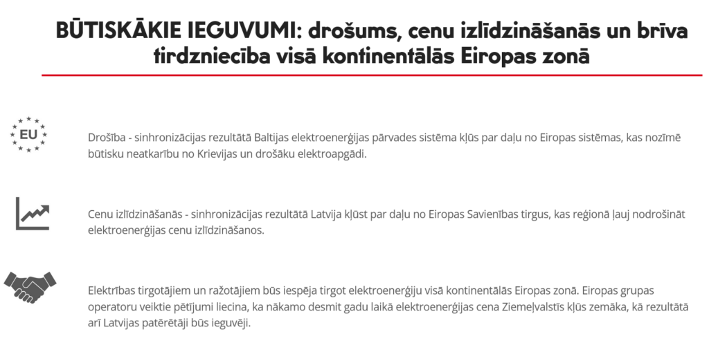 AST valdes priekšsēdētājs Rolands Irklis norāda, ka Baltijas elektroenerģijas tirgus ir adaptējies un iztiek bez elektroenerģijas importa no Krievijas. Kopš Krievijas iebrukuma Ukrainā Latvija ir pilnībā pārtraukusi elektroenerģijas importu un eksportu ar Krieviju un Baltkrieviju, un sinhronizācija ar kontinentālo Eiropu ir pēdējais solis, lai panāktu valsts neatkarību elektroapgādes jomā.