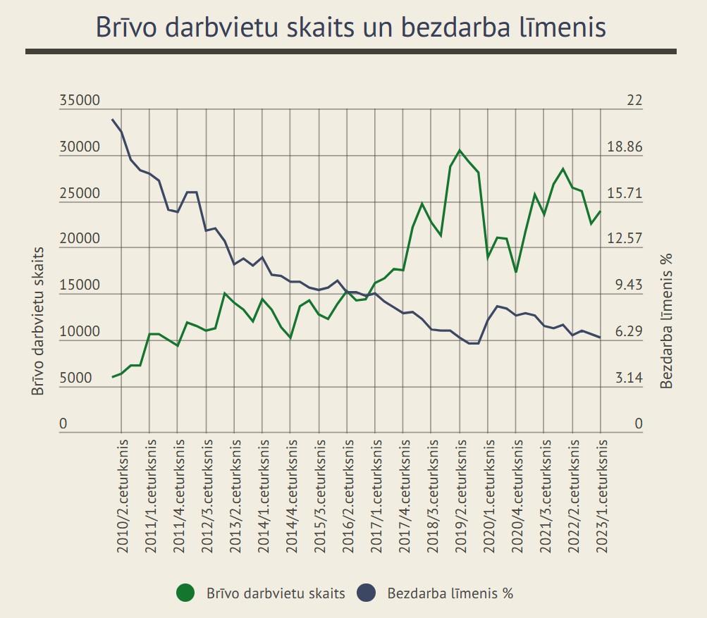 2023.gada pirmajā ceturksnī salīdzinājumā ar 2022.gada attiecīgo periodu brīvo darbavietu skaits samazinājās visās Baltijas valstīs, tostarp visstraujāk Latvijā – par 15,9%, kamēr Igaunijā kritums bija par 12,4%, bet Lietuvā – par 1,4%.