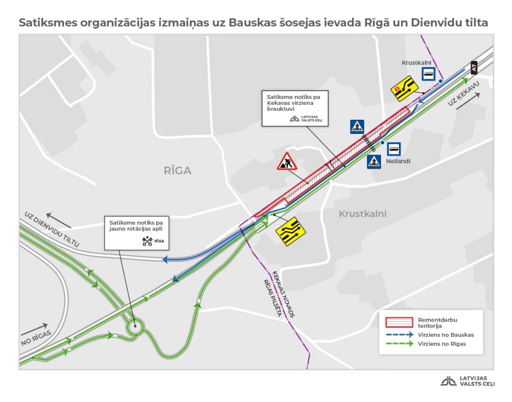 Pēc LVC minētā, izmaiņas būs iespējamas saistībā ar paplašināto brauktuvi Bauskas virzienā. Pārējā būvdarbu zonā satiksme notiks pa vienu joslu katrā virzienā.