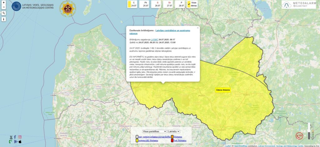 Valsts centrālajos un austrumu novados līdz plkst.13 spēkā Latvijas Vides, ģeoloģijas un meteoroloģijas centra (LVĢMC) brīdinājums par vietām gaidāmu stipru lietu.