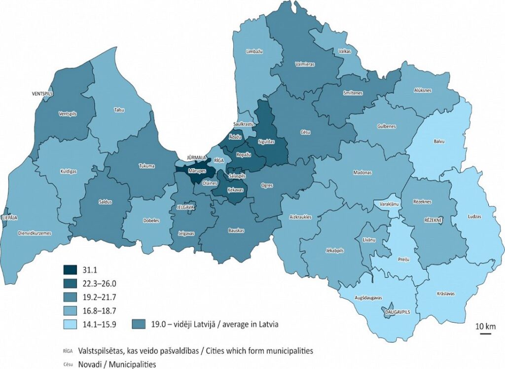 Vienlaikus starp novadiem lielākais bērnu īpatsvars bija Mārupes novadā – 30,8%, bet mazākais bērnu īpatsvars bija Krāslavas novadā – 13,8%.