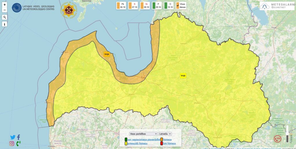 Sestdien vējš iegriezīsies no rietumiem, ziemeļrietumiem un visā teritorijā saglabāsies stiprs un brāzmains līdzīgi kā naktī uz sestdienu, bet svētdien vēja brāzmas vietām varētu būt vēl spēcīgākas, piekrastes rajonos sasniedzot pat 30 m/s. Vēja pierimšana valsts lielākajā daļā gaidāma svētdien vakarā, vien piekrastes rajonos brāzmains vējš saglabāsies līdz pirmdienas dienas vidum.