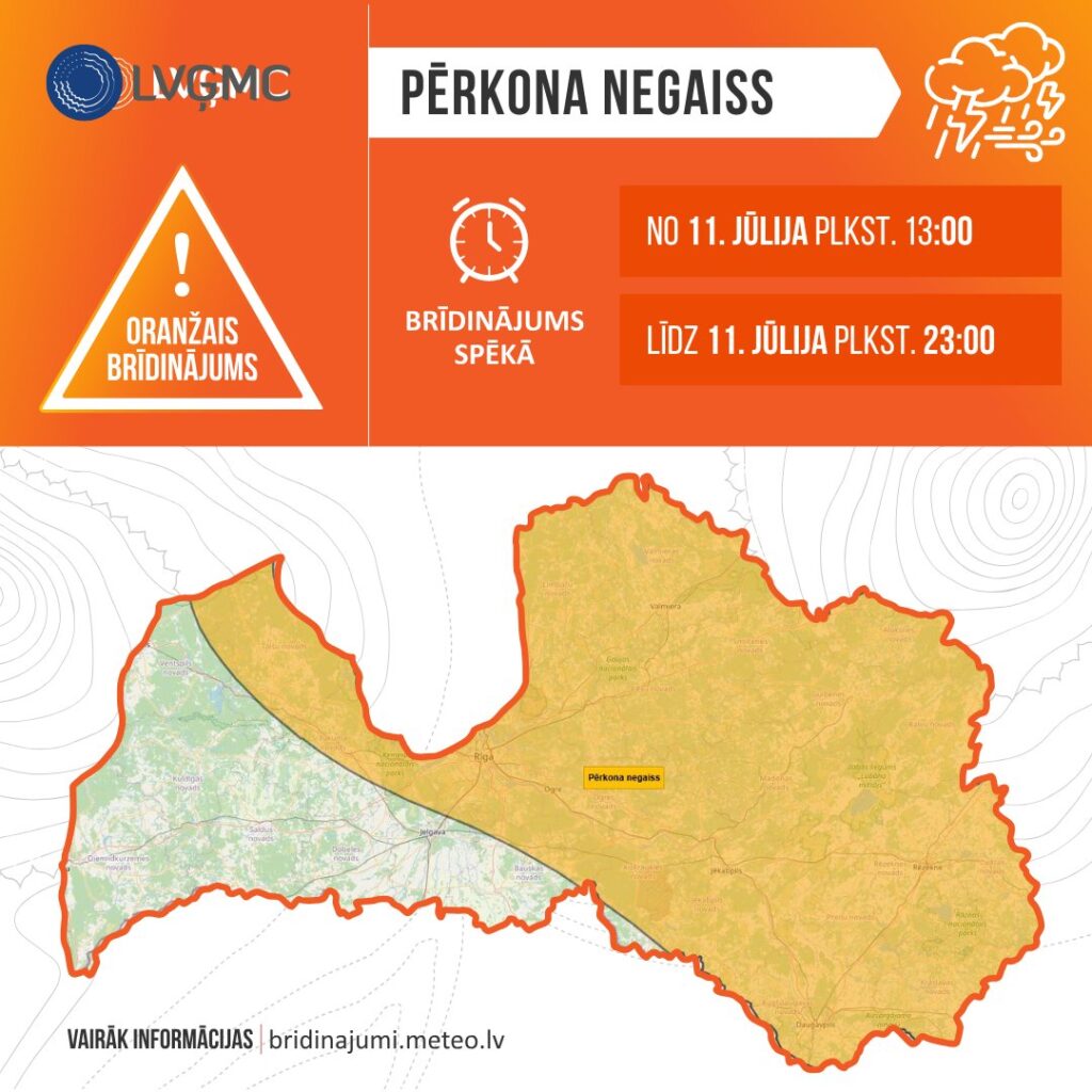 Dienā mākoņu daudzums debesīs virs Latvijas būs mainīgs. Līdz pēcpusdienai vietām gaidāms īslaicīgs lietus, iespējams arī pērkona negaiss, bet vakarā vietām centrālajos un austrumu rajonos gaidāmas ļoti stipras pērkona lietusgāzes ar lielgraudu krusu. Pastāv arī ekstremāli stipru pērkona lietusgāžu risks.