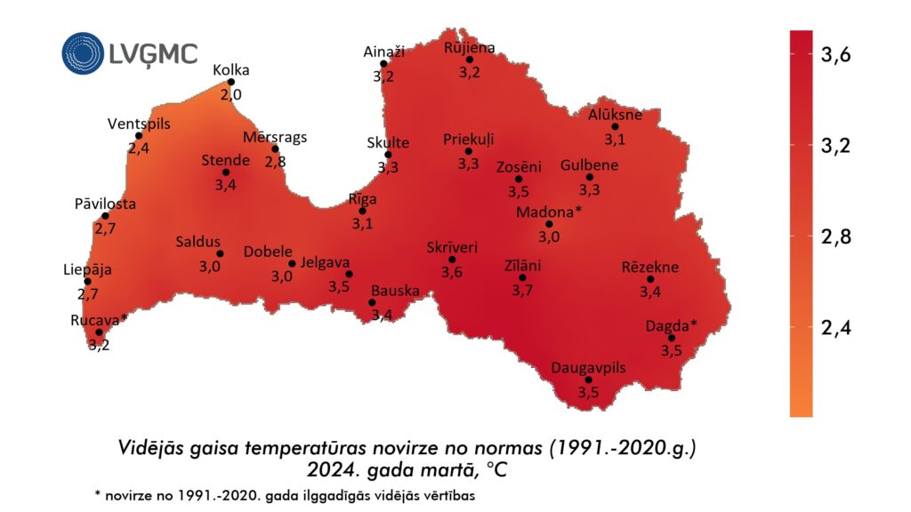 Pavasara pirmā mēneša vidējā gaisa temperatūra Latvijā bija +3,4 grādi jeb 3,2 grādi virs marta normas, liecina Latvijas Vides, ģeoloģijas un meteoroloģijas centra apkopotā informācija.