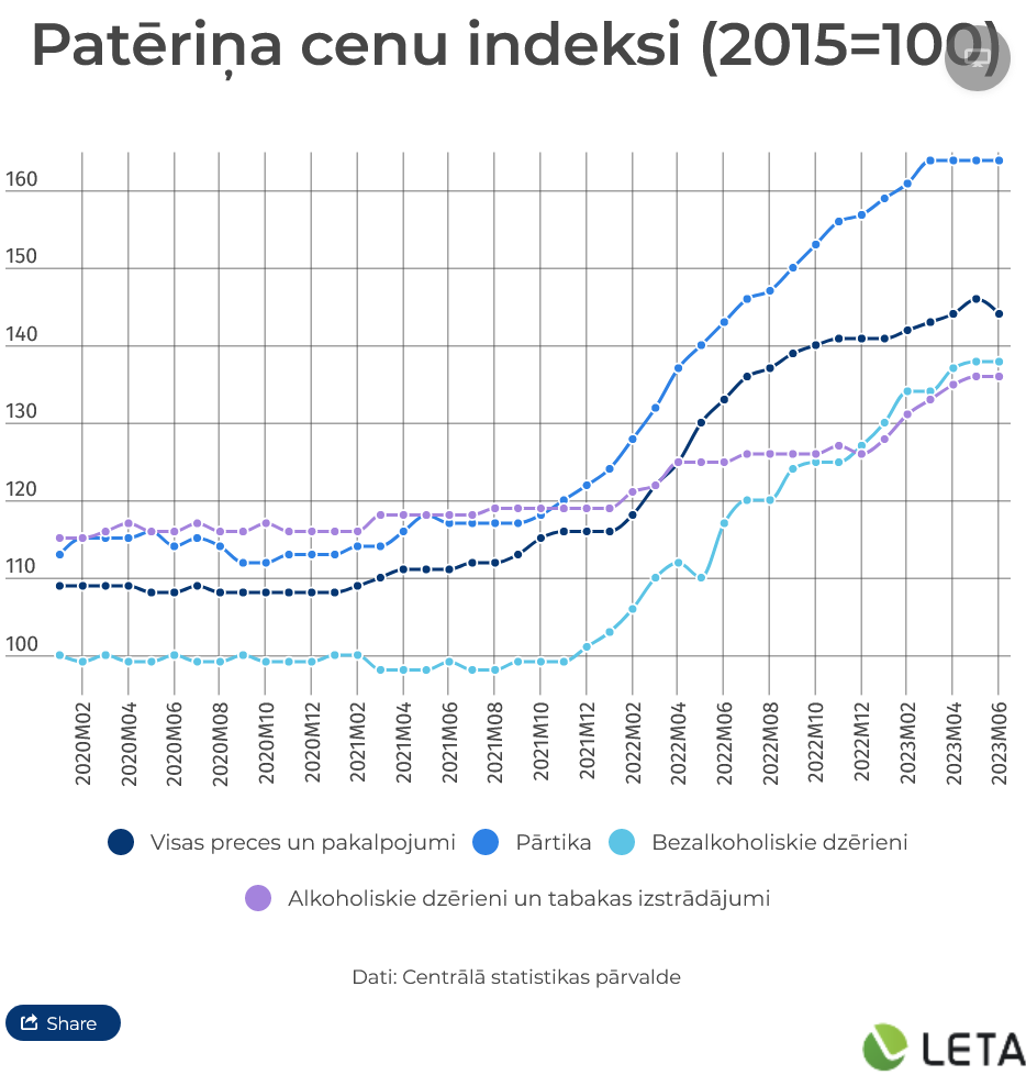 Jau vēstīts, ka Centrālās statistikas pārvades dati liecina, ka kopš maija tieši pārtikas cenām ir lielākā ietekme uz kopējo inflāciju Latvijā, apsteidzot līdzšinējo līderi – ar mājokli saistītās izmaksas. Ja jūnijā kopējā inflācija samazinājās zem 10%, tad pārtikas un bezalkoholisko dzērienu grupā cenas joprojām bija par 14,4% augstākas nekā pirms gada šajā laikā. Jūnijā gan pārtikas cenas, salīdzinot ar maiju kritās, tiesa nedaudz – par 0,1%. Turklāt virkne ekonomistu uzsver, ka vēl nevaram runāt par nopietnu pārtikas cenu samazināšanās tendenci, jo kritumu pamatā veicināja sezonālo dārzeņu cenas un akcijas veikalos.
