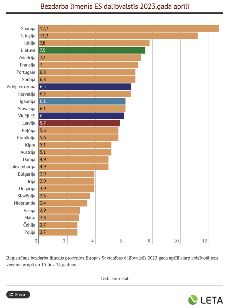 Pēc šiem datiem, augstākais bezdarba līmenis ES dalībvalstu vidū aprīlī bijis Spānijā (12,7%), Grieķijā (11,2%), Itālijā (7,8%), Lietuvā (7,5%), Zviedrijā (7,2%) un Francijā (7%).