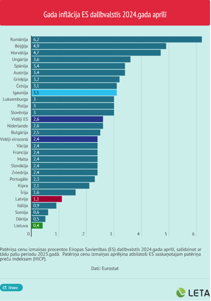 Gada inflācija Latvijā aprīlī bijusi 1,1%. Zemāka inflācija nekā mūsu valstī pagājušajā mēnesī reģistrēta Lietuvā (0,4%), Dānijā (0,5%), Somijā (0,6%) un Itālijā (0,9%). Savukārt augstākā gada inflācija bijusi Rumānijā (6,2%), Beļģijā (4,9%), Horvātijā (4,7%) un Ungārijā (3,6%). Igaunijā, tāpat kā Čehijā, gada inflācija veidojusi 3,1%.